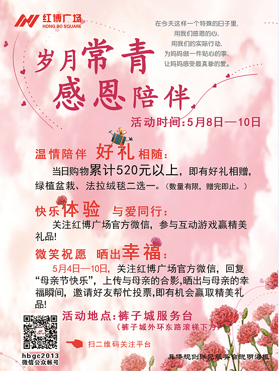 5月4日——10日,顾客关注红博广场官方微信,回复“母亲节快乐”,上传自己与母亲的合影,晒出与母亲的精彩瞬间,即有机会赢精美好礼!