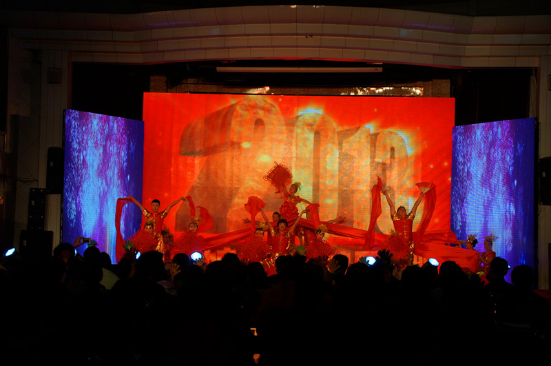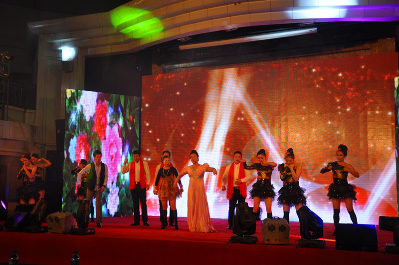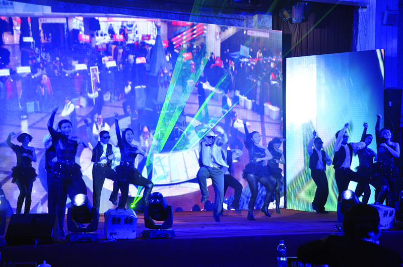 恳谈会结束之后,红博员工及业者为大家献上2013年红博商业新春联欢晚会。历时两个多月的精心准备和彩排,为所有的嘉宾带来一场品质文化的视觉盛宴。由红博广场名品城和皮装城的业者带来的舞蹈《江南style》,音乐一响便将整场激情全部点燃,演员们收放自如的表演,绚丽夺目的灯光,配合着夸张搞笑的骑马舞步,全场上下一片欢乐,掌声雷动。