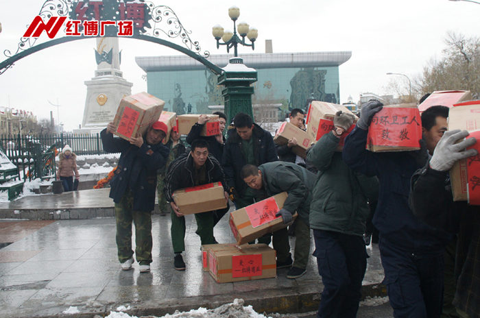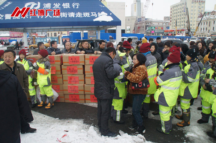 11月20日,来自红博广场的清雪志愿者,将50箱、价值5万元的保温杯、热帖等慰问品,送给正在路上清理冰雪的环卫工人,以表达对他们的关爱和敬佩之情。