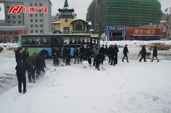 红博广场地处哈市最繁华的红军路上,车流川流不息,很不利于白天的清雪进程。为了协助附近作业的清雪工人,红博广场临时购买了清雪工具,组织全体员工走上街头,加入到清雪大军之中。一上午的时间,将红军路少年宫附近路段的积雪清理完毕,方便了市民的出行。